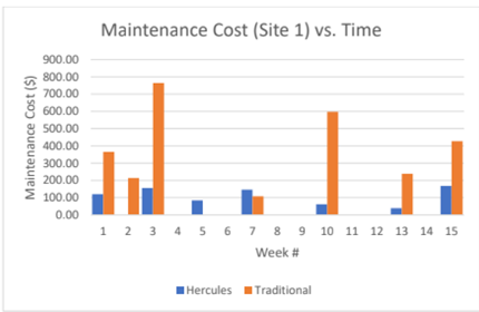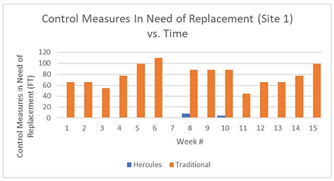 Maintenance costs for traditional controls were approximately 3.5x higher than those for Hercules Eco Block™, reflecting reduced labor and replacement frequency